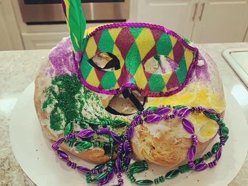 Authentic New Orleans style King Cake, with fluffy bread flour dough, cinnamon cream cheese filling, sweet icing and purple, gold, and green sprinkles. Don’t forget the baby inside!