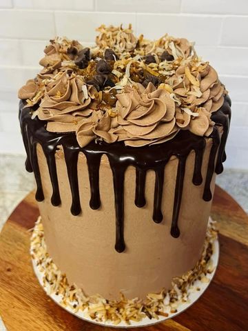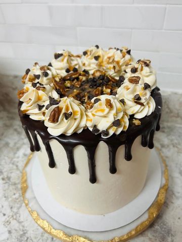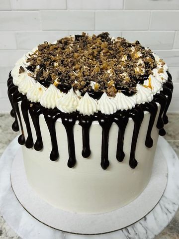 Pure heaven in a slice! Dark chocolate layers with caramel and crushed pecans between the layers, caramel buttercream icing, topped with chocolate ganache, pecan pieces, and caramel drizzle. Decadent, Divine, Dreamy; what are you waiting for?
