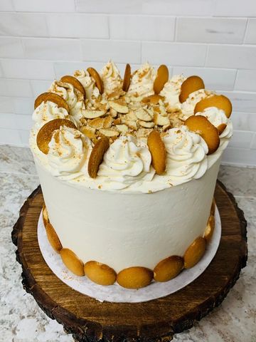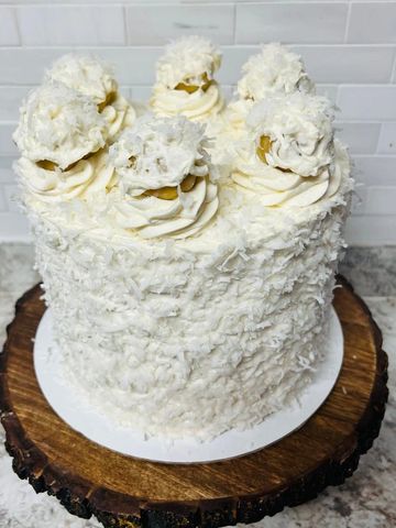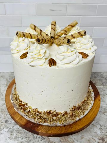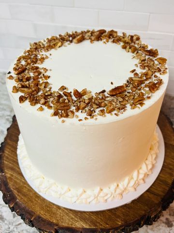 A southern-style cake bursting with crushed pecans, coconut shavings, and almond flavor in the cake batter. Frosted outside with savory cream cheese buttercream icing and beautifully decorated. A Southern experience!