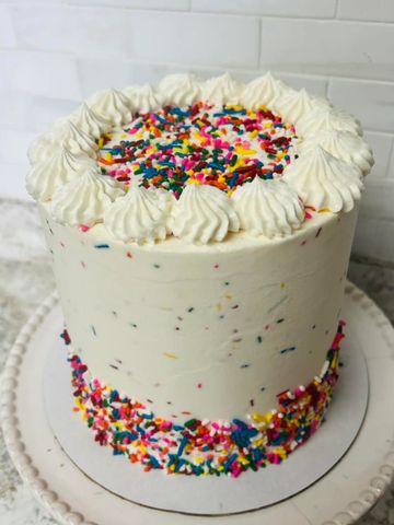 A cake designed by kids, for kids! Designed by my 10 year old son, vanilla cake layers with confetti sprinkles, coated in vanilla buttercream with more sprinkles, and up top plenty of sprinkles! Perfect for kids, or the kid in you!