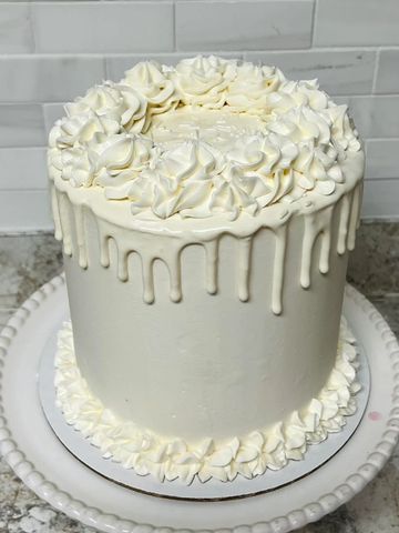 Moist perfect white cake layers surrounded by simply sweet vanilla buttercream icing. Vanilla drip up top, vanilla frosting dollops, and vanilla sprinkles. It's the perfect all-around white cake, sure to please anyone.