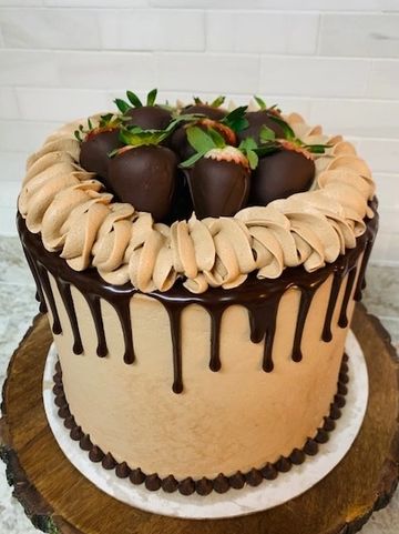 Chocolate cake layers with chocolate buttercream icing. On top gooey chocolate ganache drip and the most beautiful chocolate covered strawberries. Delicious is an understatement!
