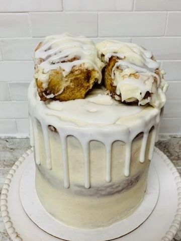 Cinnamon roll cake layers with warm and creamy cinnamon cream cheese buttercream icing in between the layers. The outside has been naked scraped with just enough icing to make that perfect cinnamon roll taste. Up top, perfectly round and fluffy cinnamon rolls and vanilla glaze. Perfect for a sweet treat or tasty breakfast option!