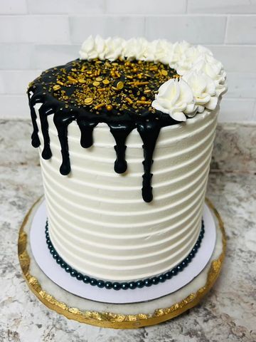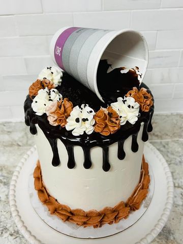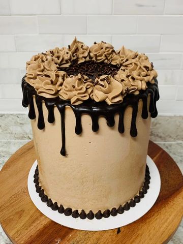Calling all Java Junkies! White mocha cake layers surrounded by rich vanilla bean buttercream icing. Coffee infused chocolate ganache drip on top, with creamy coffee tinted dollops. Better than that first cup of morning coffee!