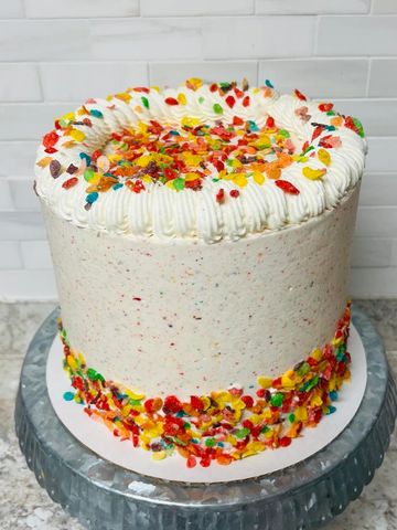 YABBA DABBA DOO! This Fruity Pebble inspired cake has white layers with Fruity Pebbles inside, vanilla buttercream with even more crushed Fruity Pebbles, and dressed perfectly with more Yabba Dabba goodness! Perfect for the kid, or the kid at heart!