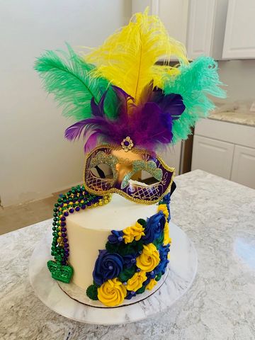 My Fat Tuesday Cake has your choice of cinnamon or vanilla cake layers, smooth cream cheese buttercream icing, and the most gorgeous Mardi Gras floral decor skirting this New Orleans inspired cake. Let’s Get Jazzy!