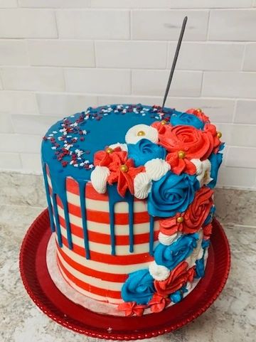 Red, White, and Blue vanilla cake layers with vanilla pudding between the layers, delicious vanilla buttercream icing so sweet you'll hear bald eagles screech. Up top, red, white and blue fireworks themed icing, star spangled sprinkles, and a dazzling show of sparklers! Nothing tastes as good as freedom, but this is pretty close!