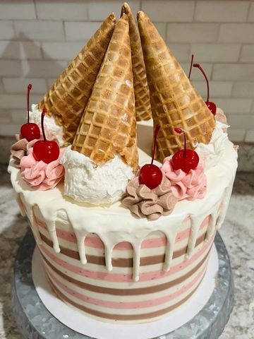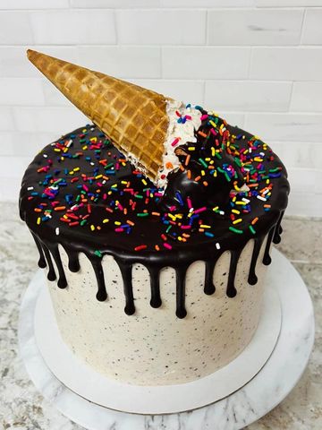 The perfect birthday cake does exist, and you can get it today! Celebrate with this colorful cake, with your choice of cake layers...chocolate, vanilla, strawberry...or all 3! The outside has chocolate chip icing and chocolate ganache drip. Atop this fun cake is a pretty ice cream cone and lots of sprinkles! HAPPY BIRTHDAY!!