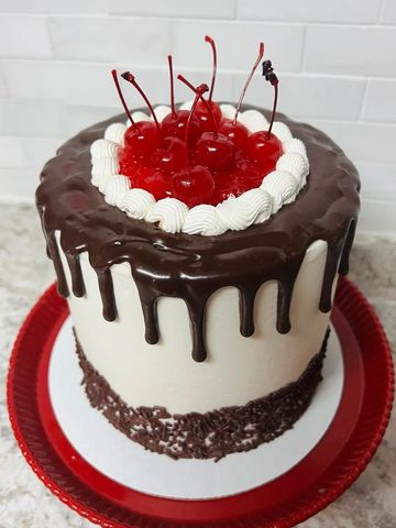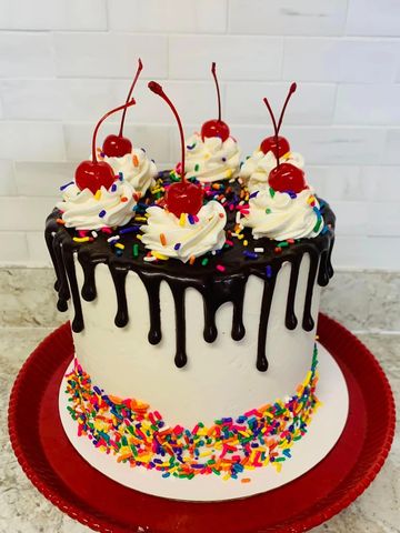 Yes, it tastes as good as it looks. Customizable cake layers, Sprinkles, vanilla buttercream frosting, hot fudge filling and drizzle, with cherries on top. This cake is what dreams are made of. What more can be said?