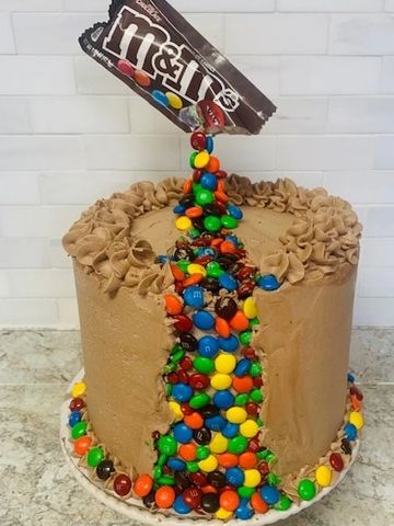 Chocolate cake layers with milk chocolate buttercream icing and M&Ms between the layers. Up top, so many M&Ms that the cake developed a rainbow filled fault line. This one will be sure to shake your taste buds as a magnitude 10 on the delicious scale!