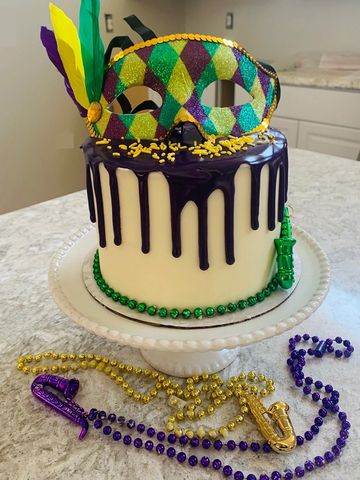 Let the good times roll when you sink your teeth into this New Orleans inspired cake. Your choice of vanilla or cinnamon cake layers, cream cheese buttercream icing, and divine royal purple ganache drip.