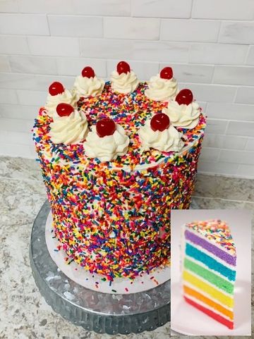 You know what's at the end of a rainbow? It's not a pot of gold, it's this beautiful cake! Vanilla cake layers in a colorful rainbow, surrounded with tasty vanilla buttercream icing covered in tons of sprinkles! Up top, vanilla frosting dollops with sweet cherries on top. Life IS all rainbows and butterflies with this happy colorful cake!
