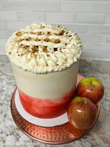 Warm fluffy apple cider layers infused with brown sugar and cinnamon dust, and freshly diced Fuji apples, smooth vanilla buttercream with apple filling and cobbler crumbles between the layers. Up top, an elegant icing ring and apple filling with cobbler crumbs.