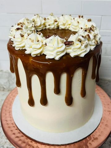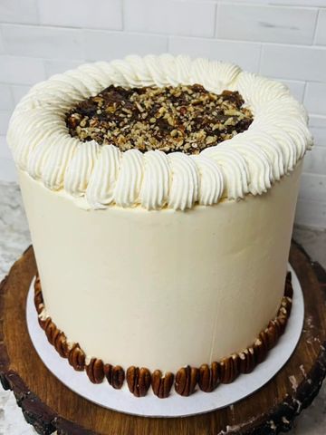 Rich butter pecan layers with caramel buttercream filling and icing, crushed pecans between each layer, andtopped with decadent made-from-scratch caramel drip.. A truly wonderful taste experience!