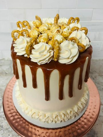 Nothing tickles your taste buds like sweet and salty flavors. Why not have both in this rich and decadent Salted Caramel Cake. Your choice of moist chocolate or vanilla layers wrapped in caramel buttercream and hidden under oozing caramel drizzle, salty pretzels, and caramel popcorn.