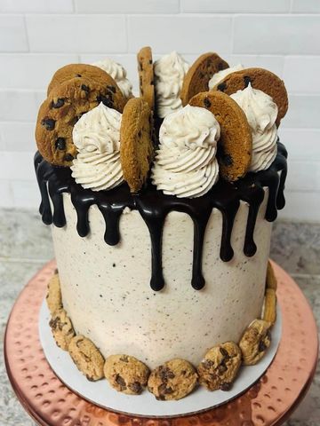 Where to begin?! Buttery golden cake layers with brown sugar and chocolate chips baked inside. Chocolate chip buttercream icing and chocolate ganache up top, with even more chocolate chip cookies! This one is good for any occasion!
