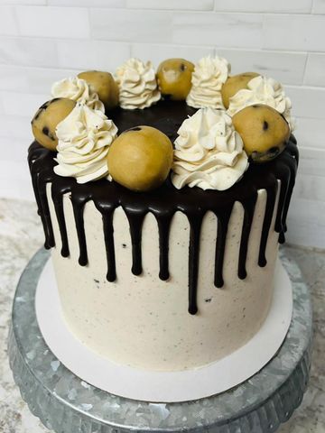Cookie Lovers Rejoice! Golden and buttery cake layers with brown sugar buttercream icing and chocolate chips. Cookie dough chunks between the layers, and up top, beautiful chocolate ganache drip with cookie dough balls and more brown sugar buttercream dollops.