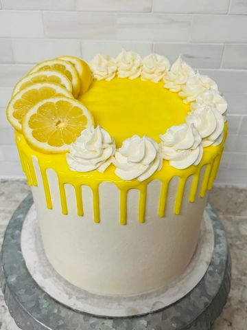 When life hands you lemons...make cake! This lemon cake has the perfect mixture of sweet and tart. Lemon cake layers made with fresh squeezed lemons and cream cheese buttercream icing. Top it all off with bright yellow drip and fresh lemon slices. Nothing better than sunshine, summertime, and lemons!