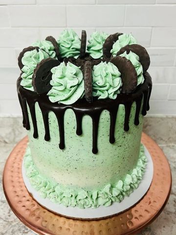 Dark chocolate layers with thin mint cookie crumbles between the layers, covered in rich mint chocolate chip buttercream icing. Up top, chocolate ganache drip with a hint of mint flavor. Can you say MMMMMMINT!