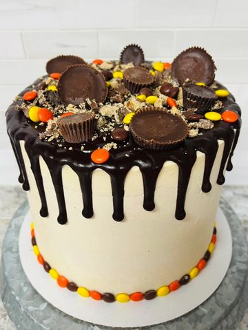 Calling all peanut butter lovers! This cake has cholocate layers with peanut butter buttercream icing, crushed Reese's between the layers, chocolate ganache, and oh yeah, piled high on top? REESE'S!!!