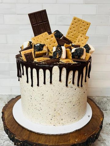 Can you smell autumn in the air? Bring back memories of chilly nights gathered ‘round the campfire with this S’mores cake. Chocolate cake layers with toasted marshmallow filling, marshmallow buttercream icing infused with Hershey's chocolate chunks and graham crackers, and up to - piles of Smore's goodies!