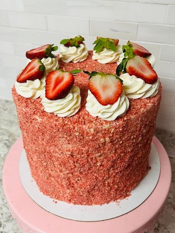 Strawberry cake layers with vanilla buttercream icing, and outside generously coated with strawberry crunch morsels. A flavor filled spring delight.